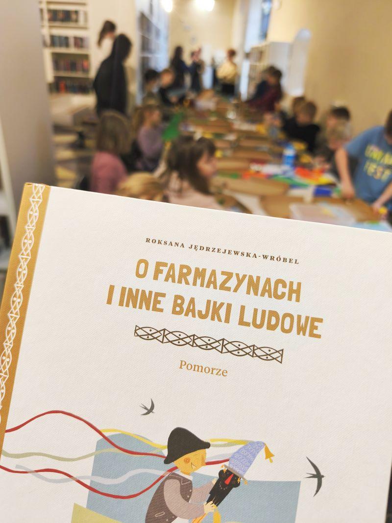 Podczas spotkania szukaliśmy odpowiedzi na liczne pytania typu kim byli farmazynowie, kaszubskie olbrzymy zwane stolemami czy też Kosznajdrzy zamieszkujący Pomorze Gdańskie. Opowieści do książki pt. O farmazynach i inne bajki ludowe przekazali autentyczni bajarze z Kaszub, Kociewia, Żuław i Powiśla, a literacko opracowała je Roksana Jędrzejewska-Wróbel. Natomiast ilustracje Joli Richter Magnuszewskiej wprowadzają w bogactwo regionalnych tradycji – od domostw, strojów i haftów, po elementy architektury. Dzieciaki po sporej dawce ciekawych opowiastek wykonały prace plastyczne i otrzymały drobne upominki Narodowego Instytutu Kultury i Dziedzictwa Wsi.