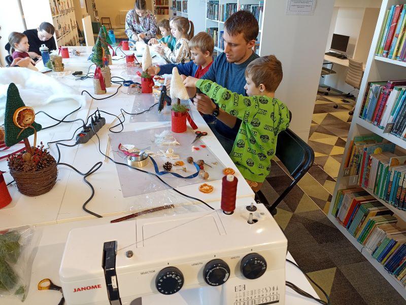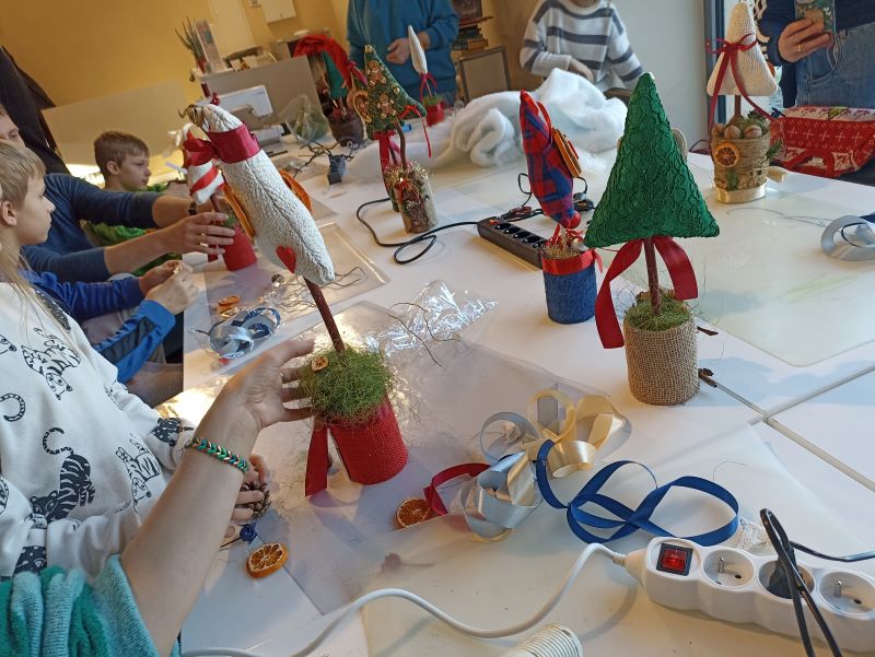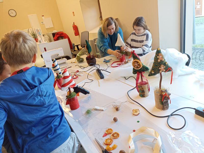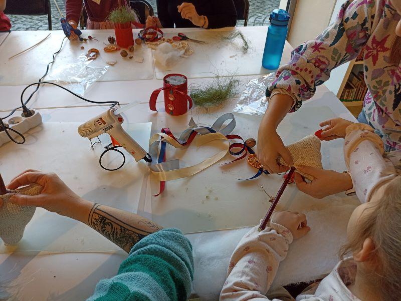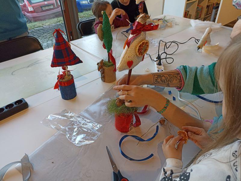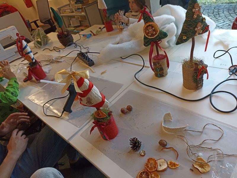 Podczas warsztatów uczestnicy wspólnie szyli, wypełniali i ozdabiali dekoracyjne choinki, wykorzystując m.in. naturalne i różnorodne materiały: szyszki, orzechy, suszone pomarańcze, kolorowe wstążeczki itp.