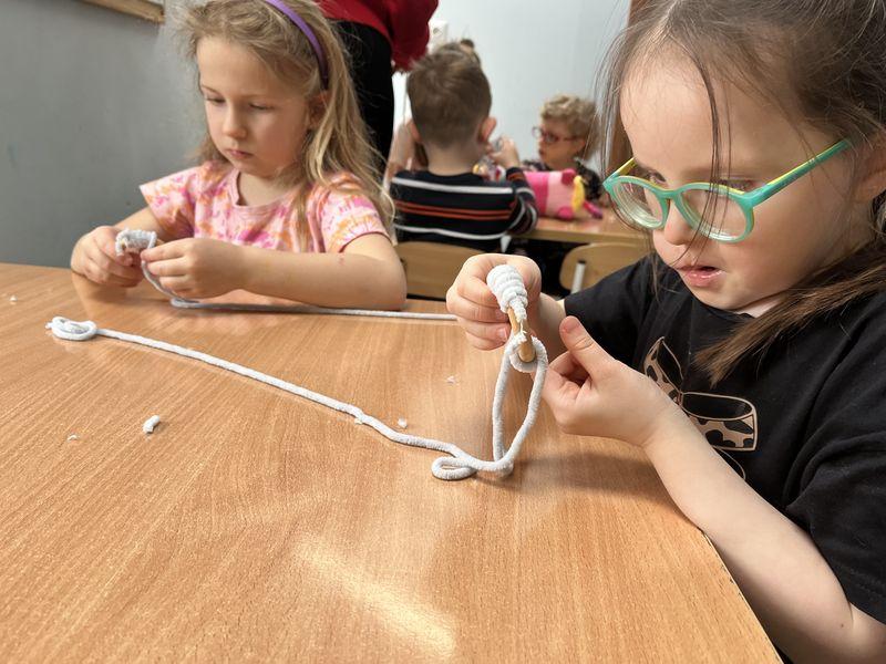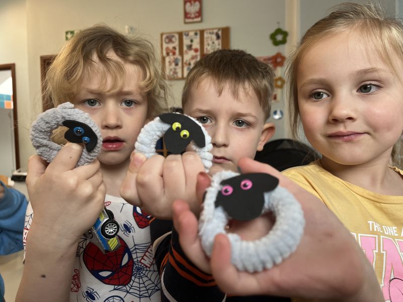 Tym razem prace wykonywane były ze sznurka oraz włóczki. Dzieci oplatały przygotowane koła sznurkiem lub kolorową włóczką, tworząc puszystego baranka. Następnie z filcu wycinały i przyklejały głowę oraz oczy. Każdy etap wymagał skupienia i dokładności, ale dzieci poradziły sobie doskonale.