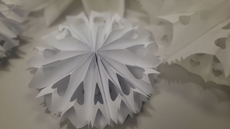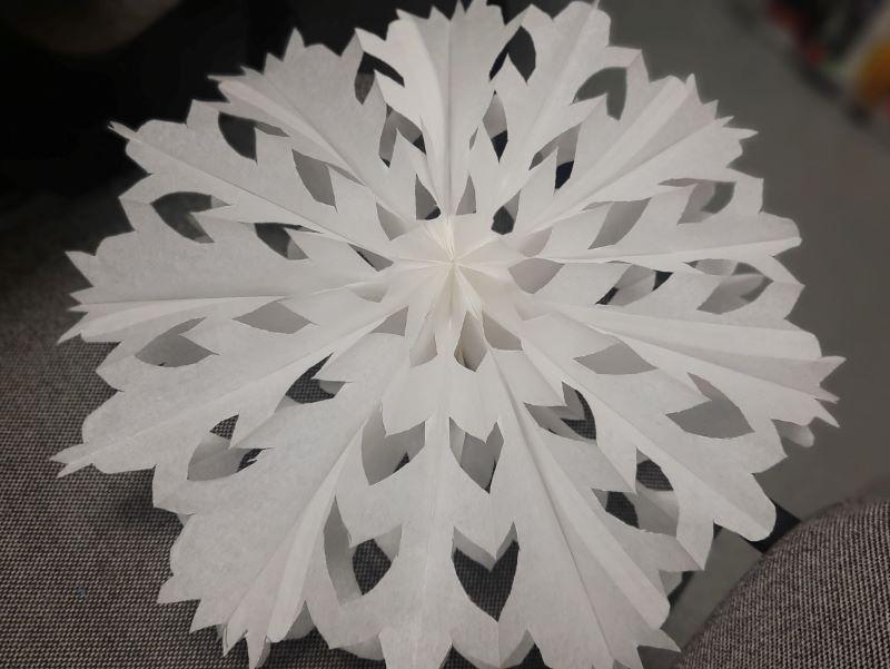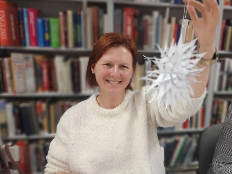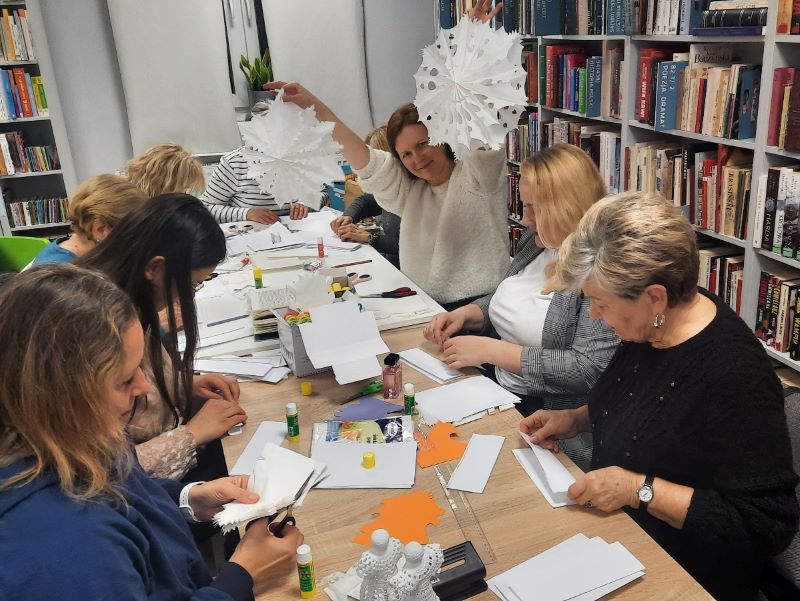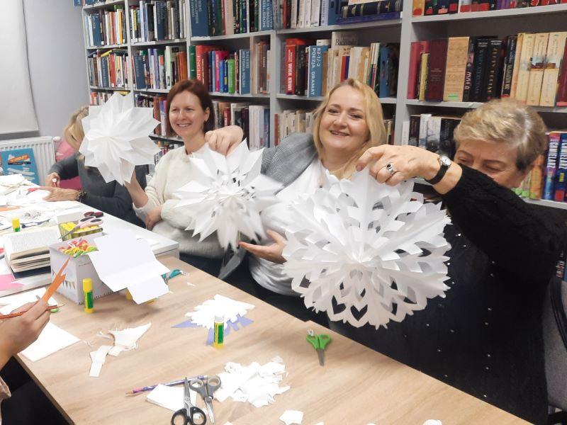 Głównym tematem spotkania było tworzenie pięknych, świątecznych dekoracji z papieru. Pod okiem prowadzącej, papierowe torebki i kartki papieru, zamieniały się w efektowne gwiazdy. Misterne cięcia nadawały niezwykły kształt wykonanym pracom.