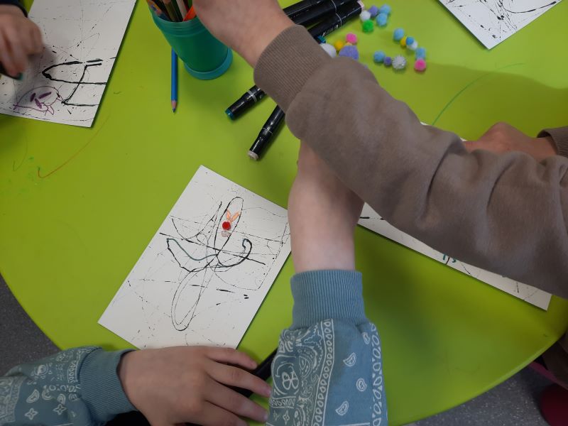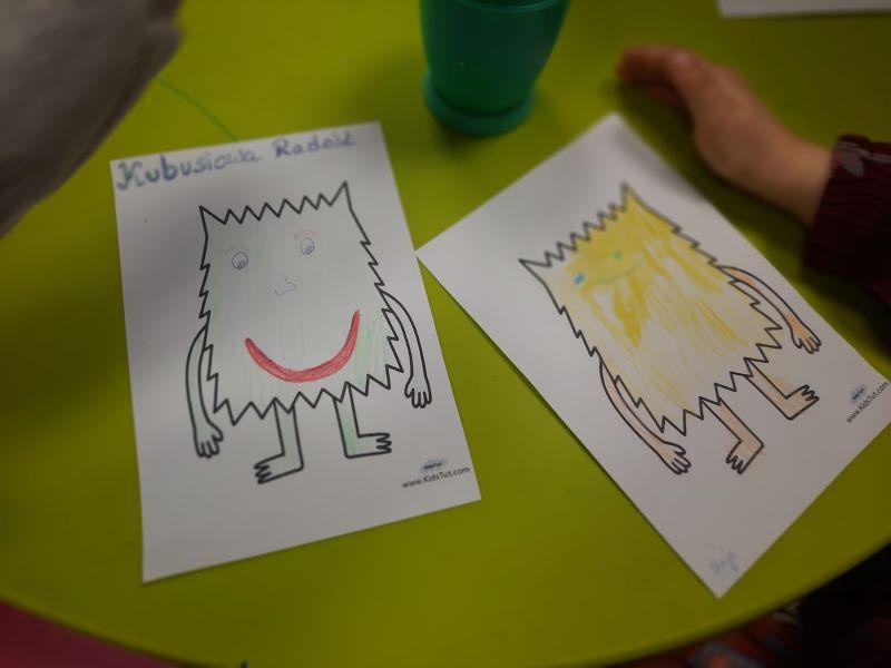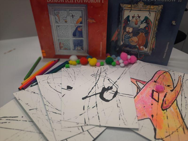 Starsza grupa zmierzyła się z nie lada wyzwaniem! Inspiracją była dla nas zabawna „Encyklopedia domowych potworów” Stanistawa Marijanovića. Po wysłuchaniu opisów najbardziej zabawnych potworów będących odzwierciedleniem różnych cech i przywar , dzieci przystąpiły do pracy twórczej. Na kartkach ozdobionych wcześniej abstrakcyjnymi, losowymi wzorami z tuszu kreślarskiego, przedszkolaki odnajdywały ukryte kształty potworów. Kolorowaliśmy je, nadawaliśmy im imiona i cechy charakteru. Choć wyobraźnia podpowiadała różne formy, okazało się, że w naszej bibliotece najchętniej zamieszkały „Potwory Śmieszki”!