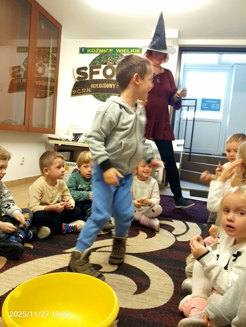 W tym roku Bibliotekę w Koźmicach Wielkich odwiedziły trzy grupy przedszkolne. Bibliotekarka poprowadziła dla dzieci serię tradycyjnych zabaw i wróżb andrzejkowych. Uczniowie z zapałem przepowiadali sobie przyszłość, starając się odkryć, co spotka ich w nadchodzącym roku. Nie zabrakło śmiechu i zaskoczeń – szczególnie wtedy, gdy jednej z uczestniczek wróżba obiecała niezapomnianą wyprawę do Japonii, jednak… cały pobyt miałaby spędzić za szafą!