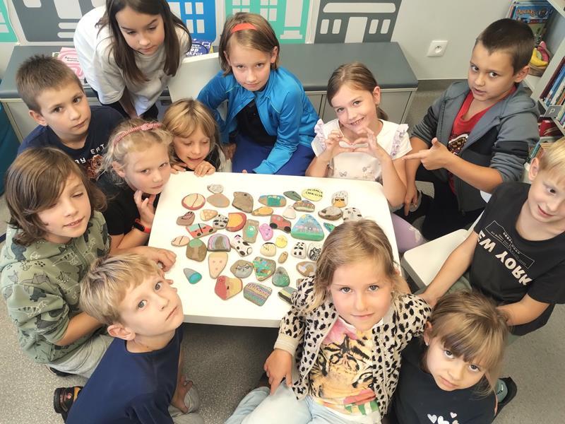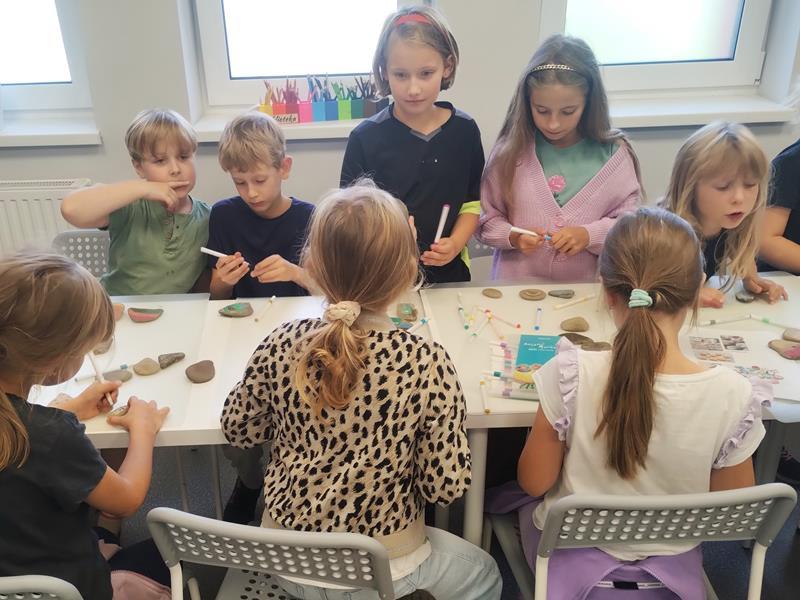 Bibliotekę w Raciborsku odwiedziły dzieci ze świetlicy szkolnej. Na spotkaniu dzieci malowały kamyczki.