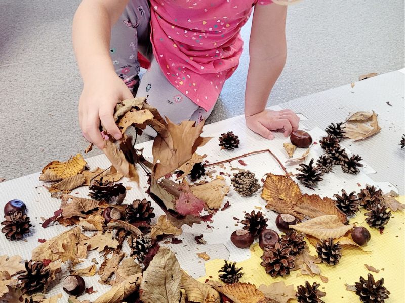 Aby wysłuchać opowieści o dwóch chłopcach, dzieci musiały przejść przez leśną ścieżkę, która była doskonałym ćwiczeniem sensorycznym. Następnie mama Ewa przeczytała historię o grzybobraniu, a dzieci wcielały się w leśnie zwierzęta spotkane w trakcie spaceru. Później same szukały grzybów.