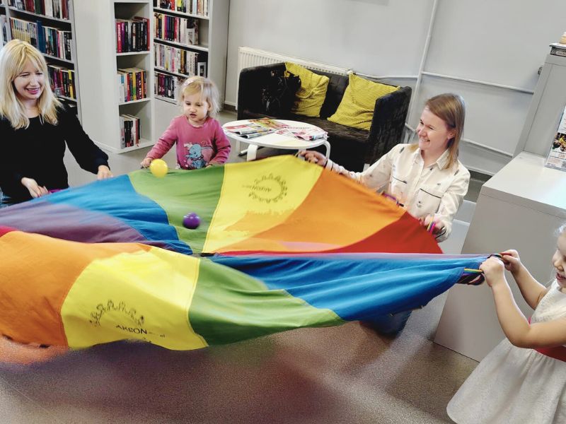 Po przeczytaniu krótkiej historii o Karolku dzieci ukryły maskotkę królika pod kolorową chustą. Zabawa w szukanie nie miała końca, tak samo jak podrzucenie kolorowych piłek. Później pobawiliśmy się w sensorycznych poszukiwaczy skarbów, gdyż małe nagrody zostały ukryte w soli i kolorowych makaronach. Finałem zabaw była zabawa w chowanego, dzieci z Czytadełek i ich mamy doskonale znają najlepsze zakamarki w bibliotece.